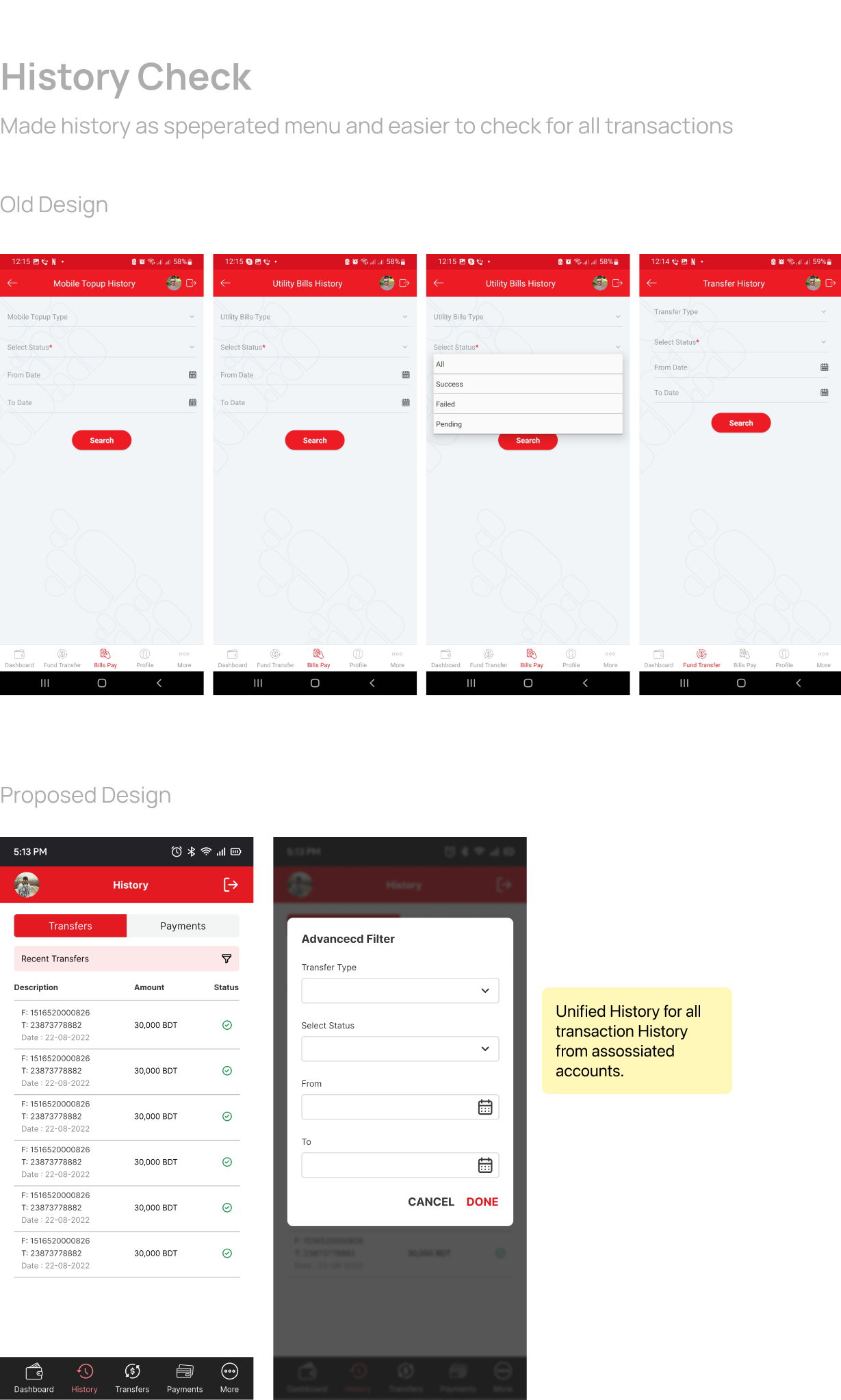 As this is a banking app most of the screens contains form elements which is necessary for banking, transfer purpose. Changing those screens and making the fields rearrange may result to hamper the soul purpose of a banking app. I decided to only focus on dashboard as users will be redirected to any kind of banking affairs with this screen.