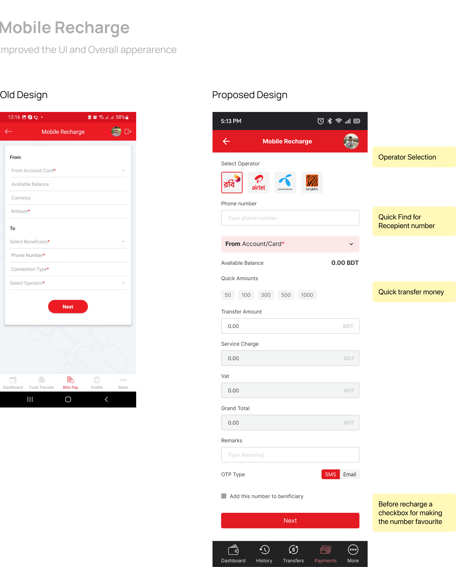 - Mobile recharge and MFS Transfers are frequent need. It takes a good amount of time to perform these tasks.